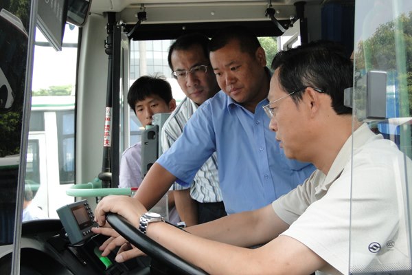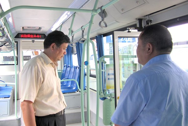 圖為集團(tuán)公司副總經(jīng)理唐建宏在公交車內(nèi)檢查車輛機(jī)務(wù)狀況