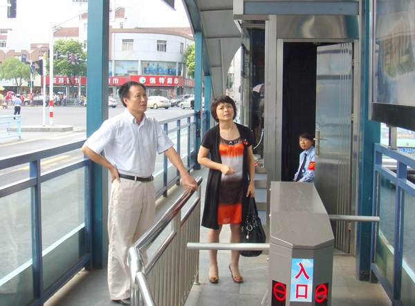 圖為集團(tuán)公司副總經(jīng)理宗洪坤在BRT站臺(tái)督察站臺(tái)設(shè)施情況