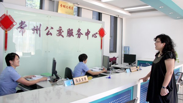 圖為集團(tuán)公司黨委副書記袁杏娣在公交服務(wù)中心督察員工優(yōu)質(zhì)服務(wù)工作情況