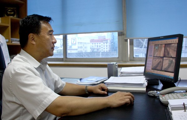 圖為集團(tuán)公司常務(wù)副總經(jīng)理孫魯明通過(guò)電腦實(shí)時(shí)察看BRT運(yùn)營(yíng)、服務(wù)情況
