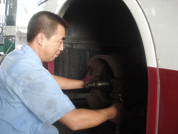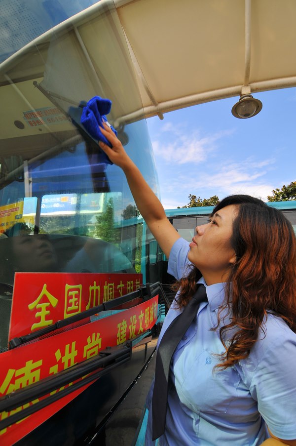 公交駕駛員擦拭車窗,保持車容車貌整潔