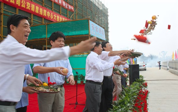圖為參加大樓封頂儀式的領導們向在場的市民和公交員工“拋梁”