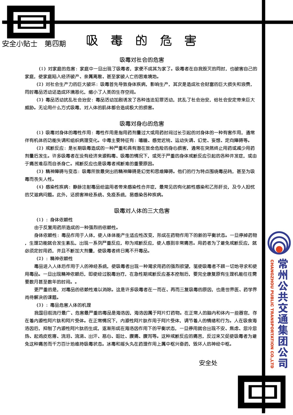 6月26日為世界禁毒日,為此,集團公司特制作第四期安全行車主題小貼士---“吸毒的危害”150份,分發(fā)至各汽車運營公司場站,供全體駕乘人員、管理人員閱讀學習,力爭從源頭上有效杜絕“毒駕”情況的發(fā)生,確保一方凈土,營造健康、和諧的工作環(huán)境和工作氛圍,為促進企業(yè)和諧穩(wěn)定發(fā)展,為構(gòu)建和諧社會而不斷努力。