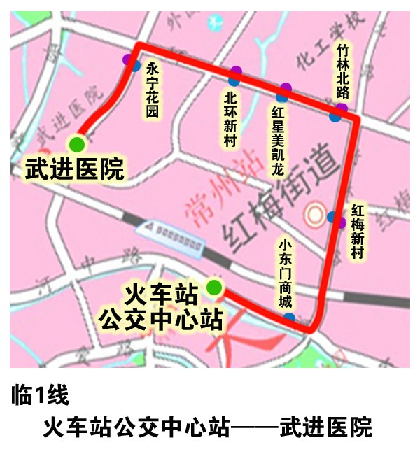 為解決城際鐵路施工,永寧路立交橋、竹林路立交、飛龍東路改造期間交通管制,14條公交線路調(diào)整,武進醫(yī)院周邊地區(qū)居民公交出行不便問題,我公司于2009年5月20日起臨時新辟臨1路,具體方案如下: