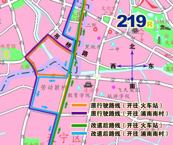 219路:由浦南南村始發(fā),下行經(jīng)新村道路、中吳大道、晉陵南路、晉陵中路、局前街、鶴園路、北太平橋路、關(guān)河中路至火車站,上行經(jīng)關(guān)河中路、和平北路、博愛路、鶴園路、局前街、小河沿、公園路、青果巷、晉陵中路、勞動西路、蘭陵北路、光華路、晉陵南路、中吳大道、新村道路至浦南南村。下行撤消九洲服裝城、廣化街、蘇寧電器、南大街衛(wèi)生服務(wù)中心??空荆簧闲谐废洗蠼中l(wèi)生服務(wù)中心、蘇寧電器停靠站,增設(shè)勞動新村、光華路??空?。