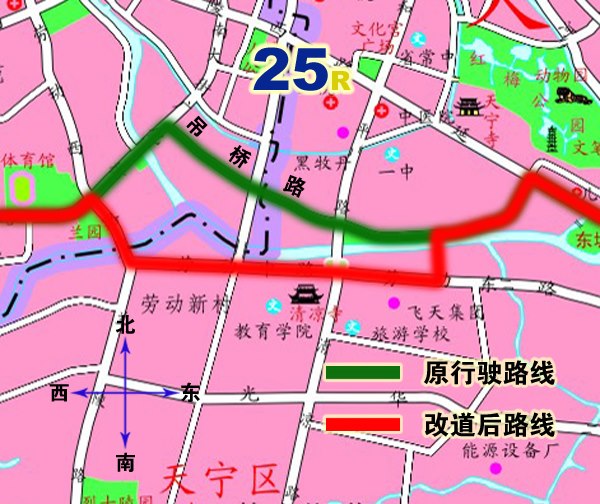 25路:由白云新村站始發(fā),按原行駛路線行駛至清潭路、勞動西路路口后,調(diào)整行駛經(jīng)勞動西路、勞動中路、紅梅南路至紅梅南路、桃園路路口后,按原行駛路線至紅星美凱龍往返。撤消原廣化街、吊橋路行駛路段,同步撤消蘇寧電器、南大街衛(wèi)生服務(wù)中心、同安橋、同濟橋上下行停靠站及廣化街下行??空荆w移德安醫(yī)院上下行??空局撂覉@路、紅梅南路路口東側(cè),調(diào)整行駛路段增設(shè)九洲服裝城、電腦城、同濟橋東上下行??空?。