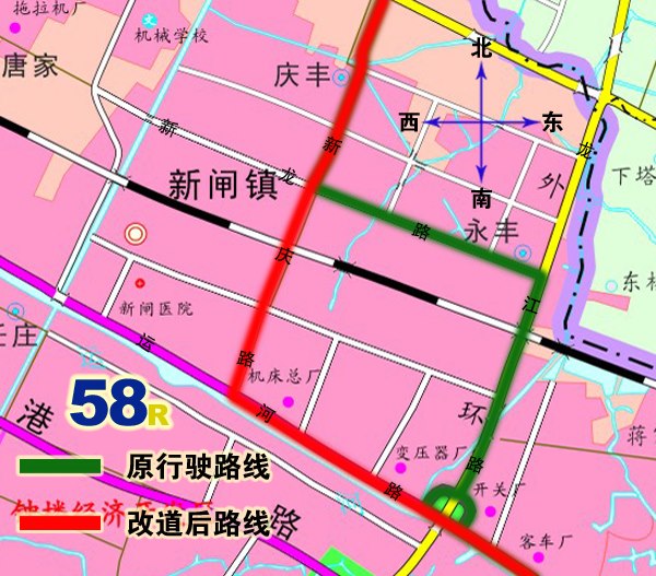 3、58路:由羅溪王下村始發(fā),按原行駛路線(xiàn)行駛至新慶路新龍路路口后,調(diào)整行駛新慶路、運(yùn)河路、至關(guān)河西路按原行駛路線(xiàn)至南大街、西瀛里環(huán)繞往返。撤消原新龍路(新慶路路口至龍江路路口)、龍江路行駛路段。同步撤消原新康路、龍江路、五星橋北上下行??空炯靶虏废滦型?空?,調(diào)整行駛路段增設(shè)新龍路、新康花苑、新慶花苑、機(jī)床廠(chǎng)、變壓器廠(chǎng)上下行??空?。