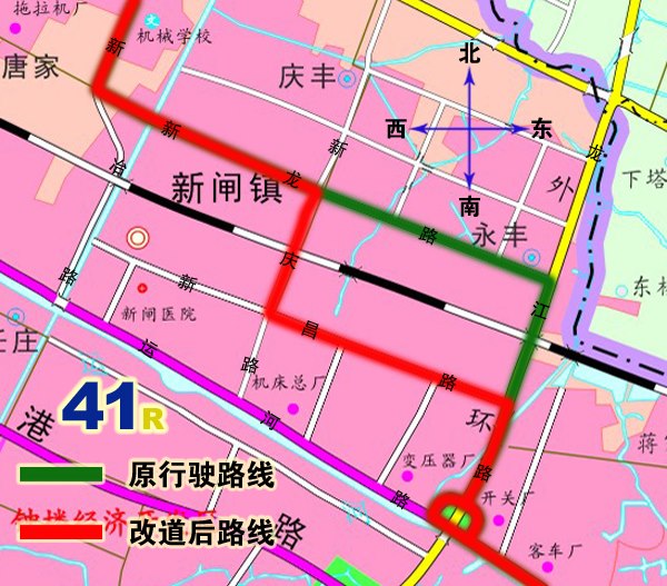 2、41路:由火車(chē)站公交中心站始發(fā),按原行駛路線(xiàn)行駛至龍江路新昌路路口后,調(diào)整行駛新昌路、新慶路至新慶路與新龍路路口后,按原行駛路線(xiàn)行駛。撤消原龍江路(新昌路路口至新龍路路口)、新龍路(龍江路路口至新慶路路口)行駛路段。同步撤消原龍江路、新康路上下行??空荆{(diào)整行駛路段增設(shè)新昌路下行站,中村、新閘民營(yíng)工業(yè)園、新康花苑上下行??空?。