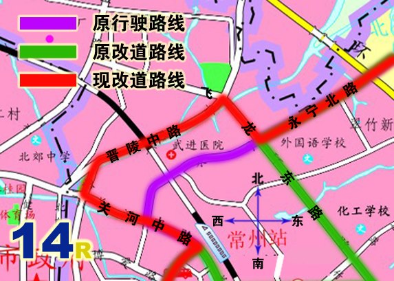 接上級(jí)部門(mén)通知,從2009年9月1日起紅菱橋竣工通車,經(jīng)我公司現(xiàn)場(chǎng)察看,對(duì)14路作出如下調(diào)整:現(xiàn)運(yùn)行線路由永寧北路公交中心站始發(fā),經(jīng)永寧北路、翠竹大道、飛龍東路、麗華北路、關(guān)河?xùn)|路、和平路恢復(fù)原線行駛。(目前因永寧路地道封閉施工改道行駛)。調(diào)整為:由永寧北路公交中心站始發(fā),經(jīng)永寧北路、翠竹大道、飛龍東路、晉陵路、關(guān)河?xùn)|路、和平路恢復(fù)原線行駛。