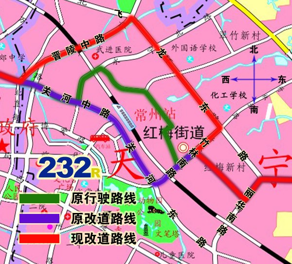 232路:由虹景花園始發(fā),按原行駛路線行駛至竹林東路竹林南路路口后,調(diào)整行駛竹林南路、飛龍東路、晉陵中路,至?xí)x陵中路關(guān)河中路路口后,按原行駛路線至廣化橋環(huán)繞往返。撤消原竹林南路(竹林東路路口至關(guān)河?xùn)|路路口)、關(guān)河路(竹林南路路口至?xí)x陵中路路口)行駛路段,同步撤消原行駛路段小東門商城上行??空?,火車站、怡康花園上下行??空荆R時(shí)增設(shè)調(diào)整行駛路段竹林北路、紅星美凱龍、北環(huán)新村、永寧花園、盛世名門、滾針軸承廠上下行停靠站,遷移原關(guān)河西路上青山橋上行停靠站至青山橋路上。