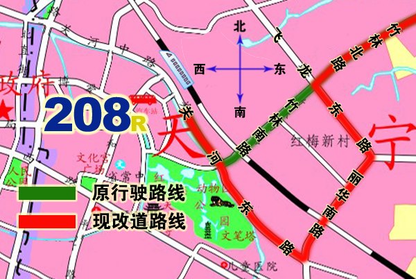 208路:由火車站公交中心站始發(fā),按原行駛路線行駛至關(guān)河?xùn)|路竹林南路路口后,調(diào)整行駛關(guān)河?xùn)|路、麗華北路、飛龍東路,至飛龍東路竹林北路路口后,按原行駛路線至牟家頭村往返。撤消原竹林南路(關(guān)河?xùn)|路路口~飛龍東路路口)行駛路段,同步撤消原行駛路段紅梅新村上下行??空?,臨時(shí)增設(shè)調(diào)整行駛路段五角場(chǎng),紅梅文化站上下行停靠站。