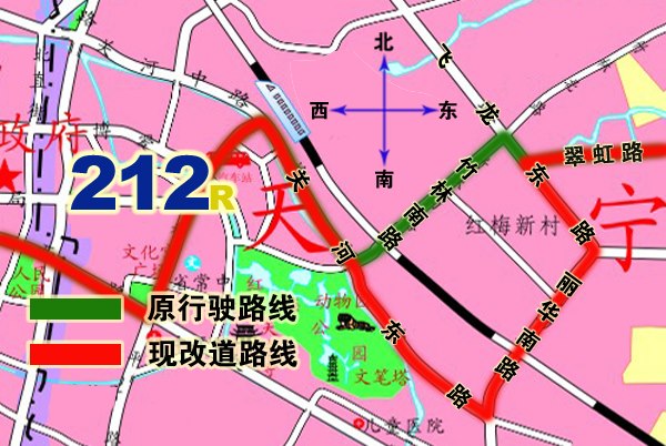 212路:由安陽(yáng)里小區(qū)始發(fā),按原行駛路線行駛至關(guān)河?xùn)|路竹林南路路口后,調(diào)整行駛關(guān)河?xùn)|路、麗華北路、飛龍東路,至飛龍東路翠虹路路口后,按原行駛路線至虹景花園往返。撤消原竹林南路、飛龍東路(竹林南路路口~翠虹路路口)行駛路段,同步撤消原行駛路段紅梅新村上下行??空荆R時(shí)增設(shè)調(diào)整行駛路段紅梅新村(麗華北路上與10路并站)、景福苑上下行??空?,遷移原飛龍東路翠虹路路口西側(cè)的紅梅東村上下行??空局谅房跂|側(cè)(該站點(diǎn)其余??烤€路同步調(diào)整)。