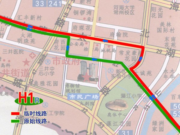6、H1路:由白蕩河公交中心站始發(fā),按原行駛路線行駛至龍錦路晉陵北路路口后,調(diào)整行駛晉陵北路、太湖東路,至太湖東路惠山南路路口后,按原線行駛至白蕩河公交中心站。臨時(shí)撤消行政中心北門、常州地稅局??空荆w移龍錦路晉陵北路交叉口西“體育中心”??空局笼堝\路晉陵北路交叉口東(與29路并站)。