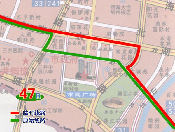 8、47路:由薛家公交中心站始發(fā),按原行駛路線行駛至太湖路通江路路口后,調(diào)整行駛太湖東路、晉陵北路,至?xí)x陵北路龍錦路路口后,按原線行駛至常州客運(yùn)中心往返。臨時(shí)撤消龍錦路上“三井橋”、“行政中心北門”、“常州地稅局”上下行??空?,遷移龍錦路晉陵北路交叉口西“體育中心”??空局笼堝\路晉陵北路交叉口東(與29路并站)。