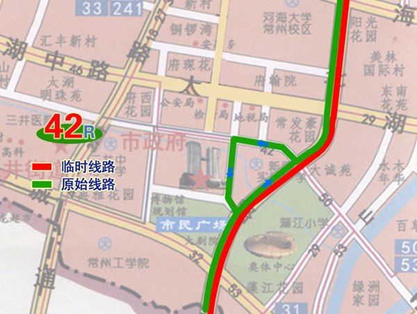 5、42路:由長(zhǎng)江貿(mào)易中心返回時(shí),按原行駛路線行駛至?xí)x陵北路龍錦路路口后,調(diào)整直行晉陵北路,至?xí)x陵北路廣場(chǎng)大道路口后,按原線行駛至荊川公園。臨時(shí)撤消惠民路上行政中心東門(上行)停靠站。