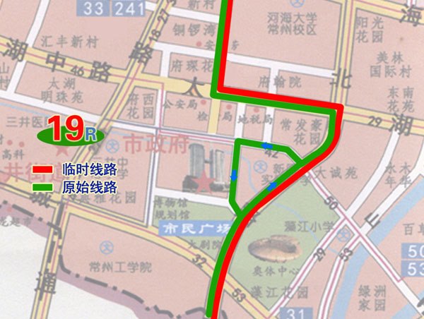4、19路:由錦海新城始發(fā),按原行駛路線行駛至?xí)x陵北路龍錦路路口后,調(diào)整直行晉陵北路,至?xí)x陵北路廣場(chǎng)大道路口后,按原線行駛至紅梅公交中心站往返。臨時(shí)撤消惠民路上行政中心東門(下行)停靠站。