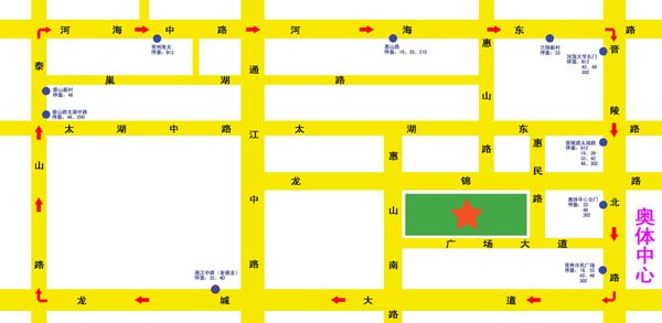根據(jù)省運(yùn)會(huì)開(kāi)幕式期間奧體中心周邊道路交通管制方案,常州公交新辟了臨時(shí)環(huán)線,方便在交通管制期間無(wú)法乘坐機(jī)動(dòng)車的人員進(jìn)入奧體中心。環(huán)線由龍城大道上的(通江中路)麥德龍始發(fā),經(jīng)龍城大道、泰山路、河海路、晉陵路、龍城大道,至通江中路(麥德龍),沿途??刻┥铰诽新贰⑻┥叫麓?、常州海關(guān)、惠山路、蘭翔新村、河海大學(xué)東門、晉陵路太湖路、奧體中心北門、常州市民廣場(chǎng)(奧體中心),服務(wù)時(shí)間為16:00~19:00。如圖:
