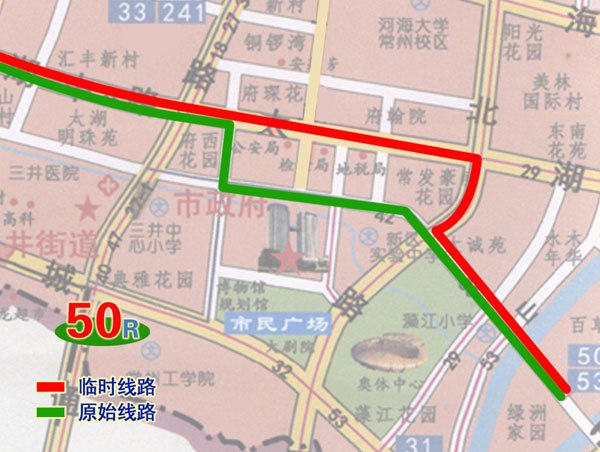 2、50路:由花園公交中心站始發(fā),按原行駛路線行駛至太湖東路惠山南路路口后,調(diào)整行駛太湖東路、晉陵北路,至?xí)x陵北路龍錦路路口后,按原行駛路線至綠洲家園往返。臨時(shí)撤消行政中心北門、常州地稅局上下行停靠站,遷移龍錦路晉陵北路交叉口西“體育中心”??空局笼堝\路晉陵北路交叉口東(與29路并站)。