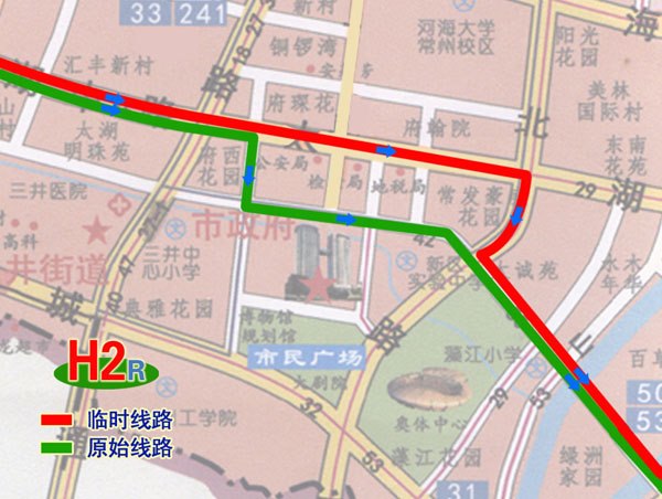 7、H2路:由永寧北路公交中心站始發(fā),按原行駛路線行駛至太湖東路惠山南路路口后,調(diào)整行駛太湖東路、晉陵北路,至?xí)x陵北路龍錦路路口后,按原線行駛至永寧北路公交中心站。臨時(shí)撤消行政中心北門、常州地稅局??空?,遷移龍錦路晉陵北路交叉口西“體育中心”??空局笼堝\路晉陵北路交叉口東(與29路并站)。