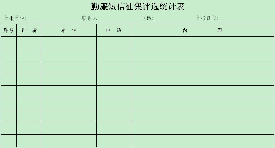 各單位于5月31日前將《勤廉短信征集評選統(tǒng)計表》(見附件)填報集團公司監(jiān)察室。電子版請放在\營運共享\08集團公司\監(jiān)察室\勤廉短信征集文件夾里。