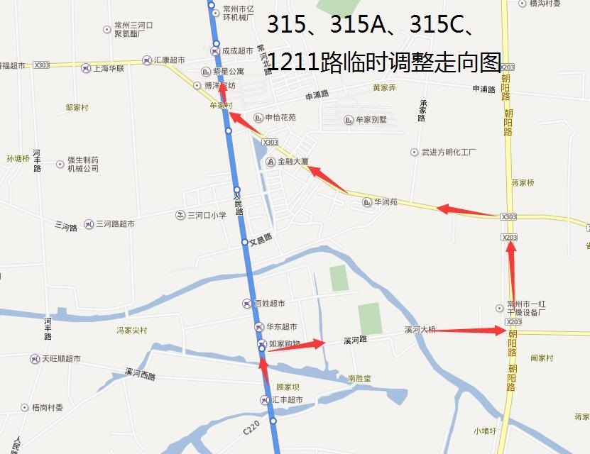 315、315A、315C、1211路:由常州客運中心始發(fā),按原線行駛至河橫路溪河路路口后,調(diào)整行駛溪河路、朝陽路、常焦線至常焦線河橫路路口后恢復(fù)原行駛路線。撤銷河橫路(溪河路—常焦線)行駛路段,同步撤銷“三河口人民橋、三河口廣場”雙向??空?;“三河口中學(xué)”臨時調(diào)整至溪河路雙向???;315、315C、1211路“牟家村”站點臨時調(diào)整至河橫北路雙向??俊?/span>