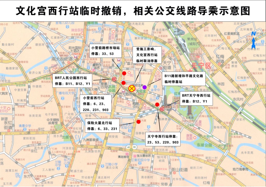 因軌道交通2號(hào)線延陵西路(周線里—和平北路)需半封閉施工,受此影響,文化宮西行常規(guī)公交站將被拆除,直接影響到6、23、33、53、220、231、903、B11、B12、Y1路的正常???,經(jīng)現(xiàn)場(chǎng)勘察,常州公交將于10月25日起,臨時(shí)撤消上述公交線路文化宮西行??空尽?/span>