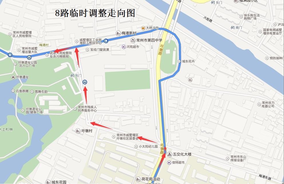 8路:由遙觀建農(nóng)村始發(fā),按原線路行駛至圩墩路戚南路路口后,調(diào)整行駛戚南路至勞動(dòng)路路口后恢復(fù)原行駛路線。由紅梅公交中心站開(kāi)往遙觀建農(nóng)村方向的保持不變。臨時(shí)撤銷圩墩路(戚南路—勞動(dòng)路)、勞動(dòng)路(圩墩路—戚南路)行駛路段。同步撤銷“戚墅堰街道”西行停靠站,調(diào)整行駛路段新增“圩墩公園東”北行??空尽?br>