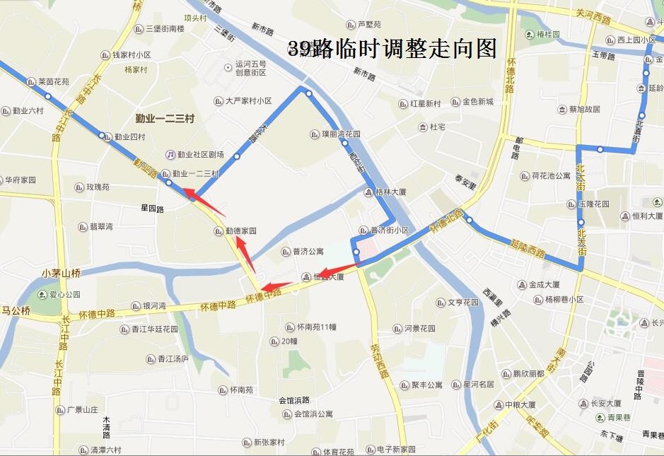 39路:由棕櫚路龍江路開(kāi)往火車(chē)站公交中心站的保持不變。由火車(chē)站公交中心站開(kāi)往棕櫚路龍江路方向,按原線(xiàn)路行駛至懷德路常春弄路口后,調(diào)整行駛懷德路、勤業(yè)路至大倉(cāng)路路口后恢復(fù)原行駛路線(xiàn)。臨時(shí)撤消常春弄(懷德路—西倉(cāng)街)、西倉(cāng)街(常春弄—大倉(cāng)路)、大倉(cāng)路(西倉(cāng)街—勤業(yè)路)行駛路段。同步撤銷(xiāo)“第四醫(yī)院、南運(yùn)橋西、西倉(cāng)橋、大倉(cāng)路”單邊停靠站,調(diào)整行駛路段新增“懷德橋西、常州梳篦博物館”單邊臨時(shí)停靠站。