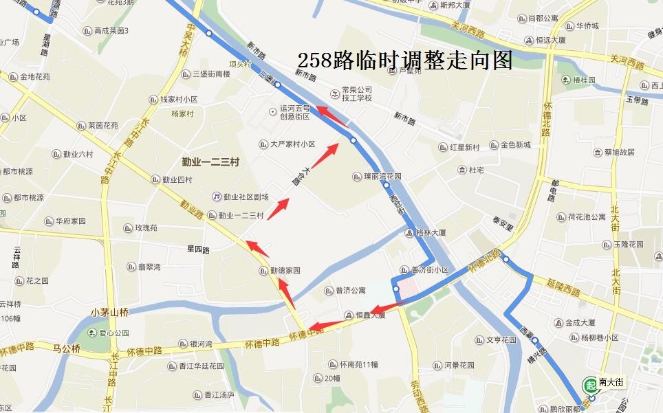258路:由新閘科技工業(yè)園開(kāi)往南大街的保持不變。由南大街開(kāi)往新閘科技工業(yè)園方向,按原線(xiàn)路行駛至懷德路常春弄路口后,調(diào)整行駛懷德路、勤業(yè)路、大倉(cāng)路至西倉(cāng)街路口后恢復(fù)原行駛路線(xiàn)。臨時(shí)撤消常春弄(懷德路—西倉(cāng)街)、西倉(cāng)街(常春弄—大倉(cāng)路)行駛路段。同步撤銷(xiāo)“第四醫(yī)院、南運(yùn)橋西”單邊停靠站,調(diào)整行駛路段新增“懷德橋西、常州梳篦博物館、大倉(cāng)路”單邊臨時(shí)??空?,同時(shí)將“西倉(cāng)橋”西行停靠站移至西倉(cāng)街大倉(cāng)路路口西邊。