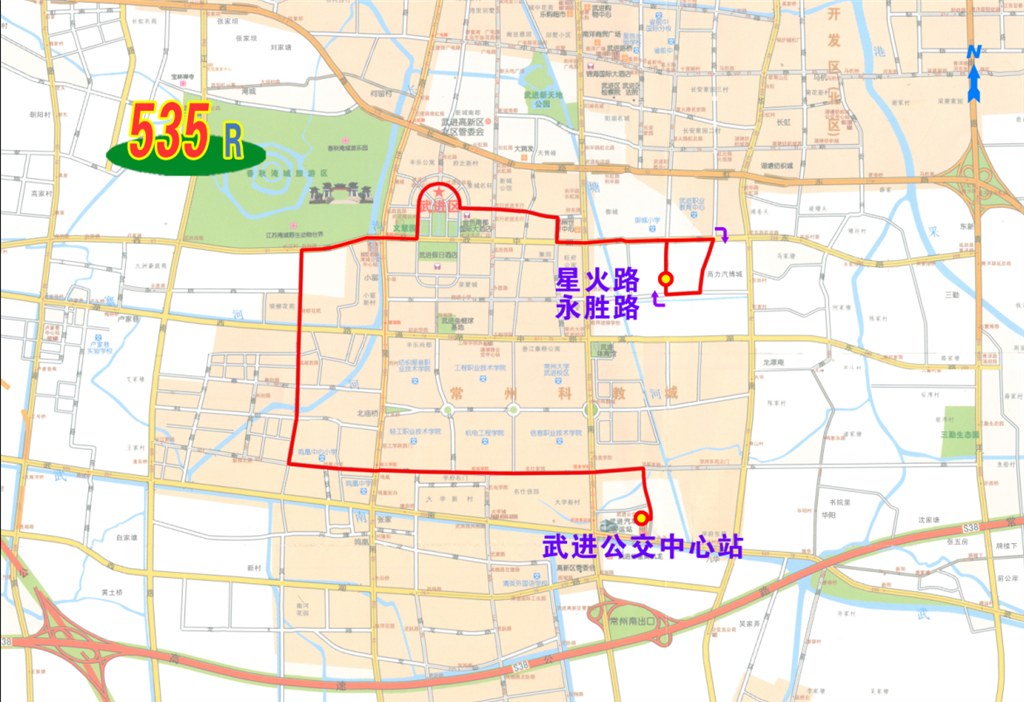 535路:由武進(jìn)公交中心站始發(fā),經(jīng)站北路、新平路、鳴新路、鳳林路、延政大道、環(huán)府路、府東路、永安路、延政大道、火炬路、永勝路、星火路至星火路永勝路返回。沿途停靠武進(jìn)公交中心站、鳴新路新平路、名仕佳園、機(jī)電學(xué)院、鳴新路蘭陵路、鳴凰北、鳴凰小學(xué)、鳳林路鳴新路、鳳林路科創(chuàng)路、鳳林路曉柳路、曉柳花苑、延政大道鳳林路、延政大道蘭陵路、武進(jìn)建設(shè)局東門、武進(jìn)區(qū)政府北門、府東路花園街、府東路梅園路、永安路府東路、御城南門、延政大道星火路、火炬路延政大道、永勝路火炬路、星火路永勝路等站。