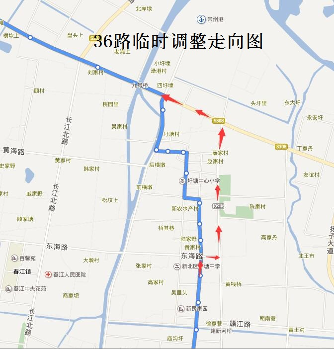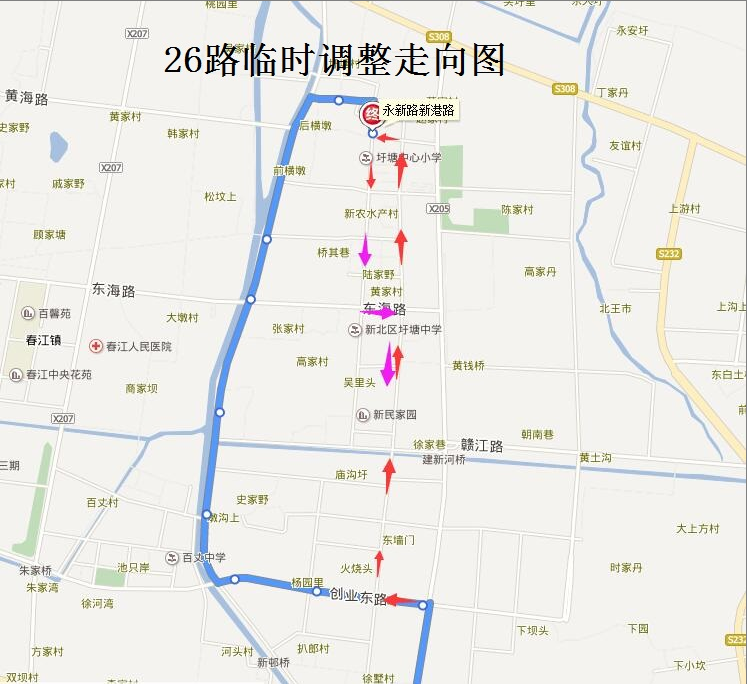 26路:由常州北站始發(fā),按原線路行駛至創(chuàng)業(yè)路盛業(yè)路路口后,調(diào)整行駛盛業(yè)路、新港路至永新路路口后,環(huán)繞永新路、東海路至盛業(yè)路路口后按原線路返回。撤銷創(chuàng)業(yè)路(盛業(yè)路—龍圩路)、龍圩路(創(chuàng)業(yè)路—永豐路)、永豐路(龍圩路—永新路)、永新路(永豐路—新港路)行駛路段,同步撤銷“百丈工業(yè)園、盛揚橋、百丈東、圩塘康樂中心、大墩橋”雙向??空炯?ldquo;青松橋、永豐路龍圩路”單向停靠站,調(diào)整行駛路段增設(shè)“新業(yè)花苑”雙向及“圩塘五村、圩塘”北行臨時??空?,永新路新港路站移至新港路路口南邊停靠。