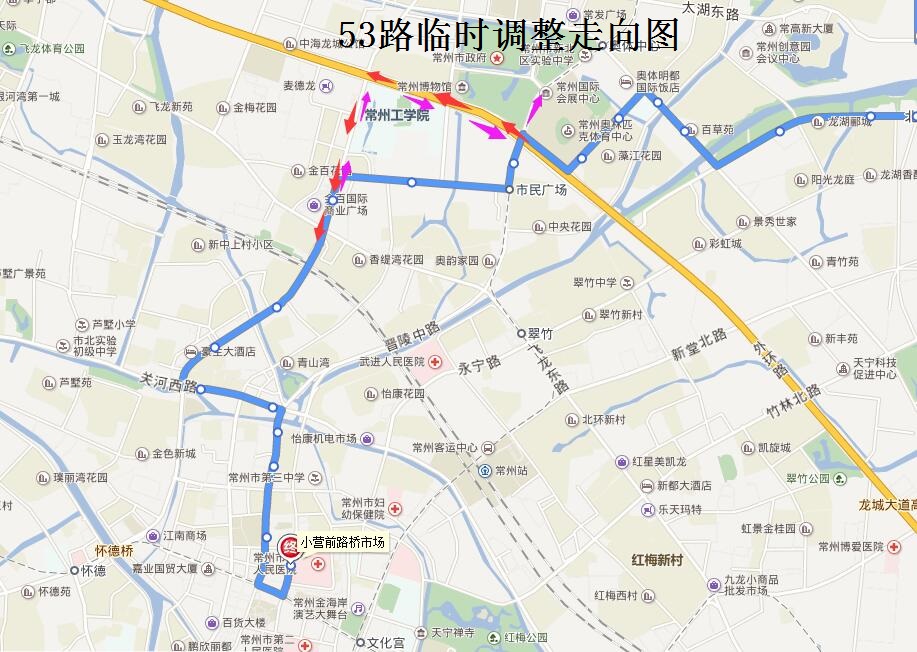為配合地鐵二號線紅梅公園站施工,減少周邊主干道交通壓力;同時因城市路網(wǎng)建設(shè),惠國路(錦繡路—龍城大道)、錦繡路(惠國路—晉陵路)實施交通管制,常州公交將于2017年2月20日起對涉及的53路公交進(jìn)行調(diào)整,具體調(diào)整方案如下: