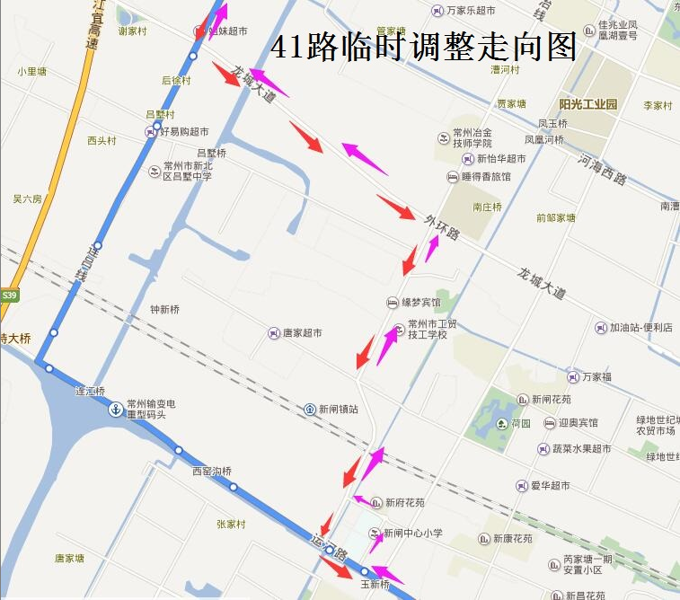 41路:由湯莊商貿(mào)中心始發(fā),按原線路行駛至呂湯路龍城大道路口后,調(diào)整行駛龍城大道、新冶路至運河路路口后恢復(fù)原線路行駛(上行走新府路、新昌路至新冶路)。臨時撤銷呂湯路(龍城大道—運河路)、運河路(呂湯路—新冶路)行駛路段,同步撤銷“呂湯路龍城大道、呂墅、呂墅道口北、山莊村、連江橋、電修廠、東窯溝橋”雙向及“新閘西”西行停靠站;繞行路段增設(shè) “龍城大道呂湯路、德勝河橋東、新閘前進(jìn)村、新冶路新前路、常州工貿(mào)學(xué)校、新冶路新龍路、新冶路新昌路”雙向及“新閘街道”西行臨時??空?。