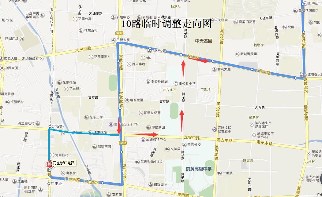 10路:由永寧路公交樞紐始發(fā),按原線路行駛至和平路定安路路口后,調(diào)整行駛定安路、降子路至人民路路口后返回。撤銷和平路(定安路—廣電路)、廣電路(和平路—花園街)、花園街(廣電路—定安路)、定安路(花園街—和平路)行駛路段,同步撤銷“和平路定安路”南行、“邱墅”西行、“花園街廣電路”北行、“中壯新村、定安路和平路”東行、“和平路古方路”雙向、“武進(jìn)建行”北行、“陽湖綜合市場(chǎng)”東行??空?,調(diào)整行駛路段增設(shè)“和平路定安路(武進(jìn)購物中心)、湖塘實(shí)驗(yàn)中學(xué)”東行臨時(shí)??空尽?/span>