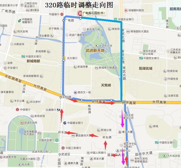 320路:由禮嘉首末站始發(fā),按原線路行駛至和平路延政大道路口后,調(diào)整環(huán)繞行駛延政大道、永安路、府東路、花園街、長虹路、和平路至延政大道路口后返回。撤銷和平路(長虹路—廣電路)、廣電路、花園街(廣電路—長虹路)行駛路段,同步撤銷“武進(jìn)世貿(mào)中心”北行、“長虹路和平路、長虹路梅園路”西行、“新城南都、新天地廣場(chǎng)”北行、“廣電路花園街、邱墅”東行、“和平路廣電路、和平路長安路、和平路虹北路”南行停靠站,調(diào)整行駛路段增設(shè)“府東路永安路、府東路梅園路”西行、“花園街府東路(農(nóng)行武進(jìn)支行)”北行、“長虹路花園街(路勁·又一城)、長虹路梅園路”東行臨時(shí)??空?。