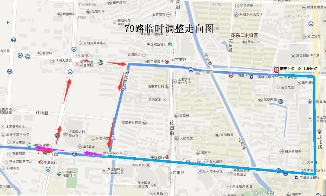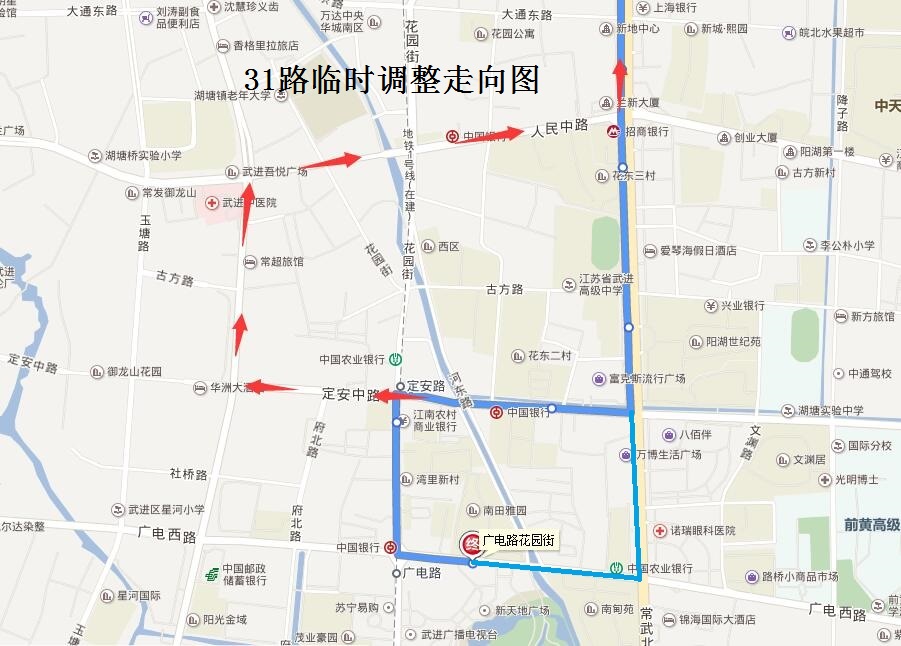 31路:由永寧路公交樞紐始發(fā),按原線路行駛至定安路花園街路口后,調(diào)整行駛定安路、蘭陵路、人民路至和平路路口后恢復(fù)原線路行駛。撤銷花園街(定安路—廣電路)、廣電路(花園街—和平路)、和平路(廣電路—定安路)行駛路段,同步撤銷“湖塘灣里小區(qū)”南行、“廣電路花園街、邱墅”東行、“和平路定安路、和平路古方路、武進(jìn)建行”北行??空荆{(diào)整行駛路段增設(shè)“定安路蘭陵路”西行、“人民路蘭陵路、東風(fēng)橋”東行臨時(shí)??空尽?/span>