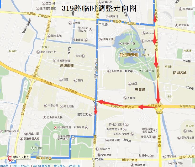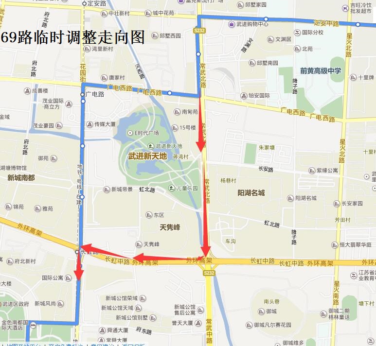 69、319路:由遙觀首末站始發(fā),按原線路行駛至和平路廣電路路口后,調(diào)整行駛和平路、長虹路至花園街路口后恢復(fù)原線路行駛。撤銷廣電路(和平路—花園街)、花園街(廣電路—長虹路)行駛路段,同步撤銷 “邱墅、花園街廣電路、新城南都”雙向,“新天地廣場(chǎng)”南行??空?,調(diào)整行駛路段增設(shè)“和平路廣電路、和平路長安路、和平路虹北路、長虹路和平路、長虹路梅園路”雙向、“長虹路花園街(路勁·又一城)”東行臨時(shí)??空?。