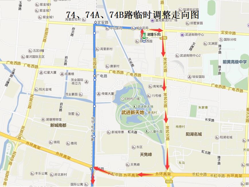 74、74A、74B路:由湖塘樂購始發(fā),按原線路行駛至定安路路口后,調(diào)整行駛定安路、和平路、長虹路至花園街路口后恢復(fù)原線路行駛。撤銷定安路(回車場(chǎng)—花園街)、花園街(定安路—長虹路)行駛路段,同步撤銷 “湖塘灣里小區(qū)、花園街廣電路、新城南都”雙向,“新天地廣場(chǎng)”南行??空荆{(diào)整行駛路段增設(shè)“和平路廣電路、和平路長安路、和平路虹北路、長虹路和平路、長虹路梅園路”雙向臨時(shí)??空?。