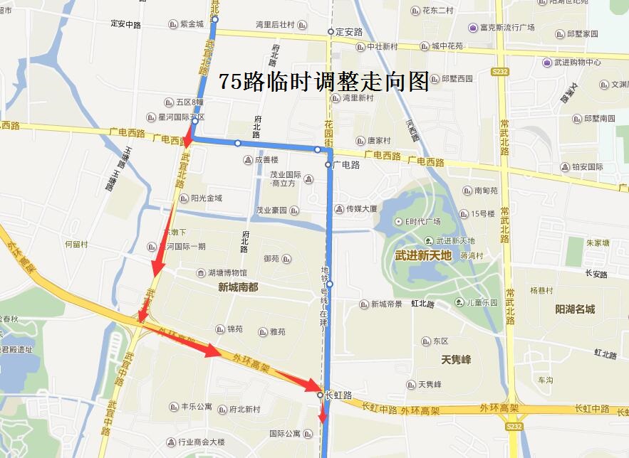 75路:由白云路公交站始發(fā),按原線行駛至蘭陵路廣電路路口后,調(diào)整行駛蘭陵路、長虹路至花園街路口后恢復(fù)原行駛路線。撤銷廣電路、花園街(廣電路—長虹路)行駛路段。同步撤銷“廣電路蘭陵路”東行、“泰富灣義烏市場(chǎng)、花園街廣電路、新天地廣場(chǎng)、新城南都”雙向及“路勁·又一城”北行??空?;調(diào)整行駛路段新增“四季青服裝城”南行、“長虹路蘭陵路”東行及“蘭陵路長虹路”北行臨時(shí)??空?。