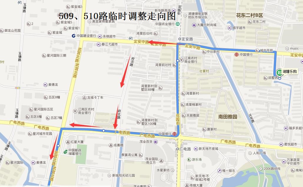 509、510路:由湖塘樂購始發(fā),按原線行駛至定安路花園街路口,調(diào)整行駛定安路、府北路至廣電路路口后恢復(fù)原線路行駛。撤銷花園街(定安路—廣電路)、廣電路(花園街—府北路)行駛路段,同步撤銷“湖塘灣里小區(qū)”雙向、“泰富灣義烏市場(chǎng)”東行??空?;調(diào)整行駛路段新增“中壯新村”西行、“府北路定安路”雙向、“府北路廣電路”北行臨時(shí)停靠站。