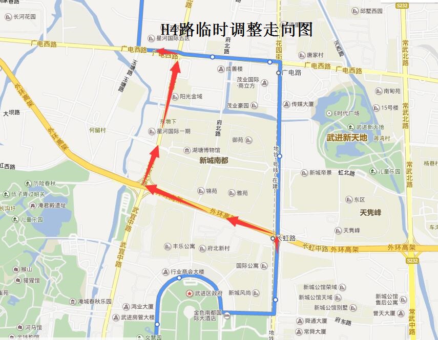 H4路:由淹城公交樞紐始發(fā),按原線路行駛至花園街長虹路路口后,調(diào)整行駛長虹路、蘭陵路至廣電路路口后恢復(fù)原線路行駛。撤銷花園街(廣電路—長虹路)、廣電路(蘭陵路—花園街)行駛路段,同步撤銷 “新城南都、新天地廣場(chǎng)”北行、“廣電路花園街、泰富灣義務(wù)市場(chǎng)”西行??空?,調(diào)整行駛路段增設(shè)“四季青服裝城”南行、“長虹路蘭陵路”東行臨時(shí)??空?。