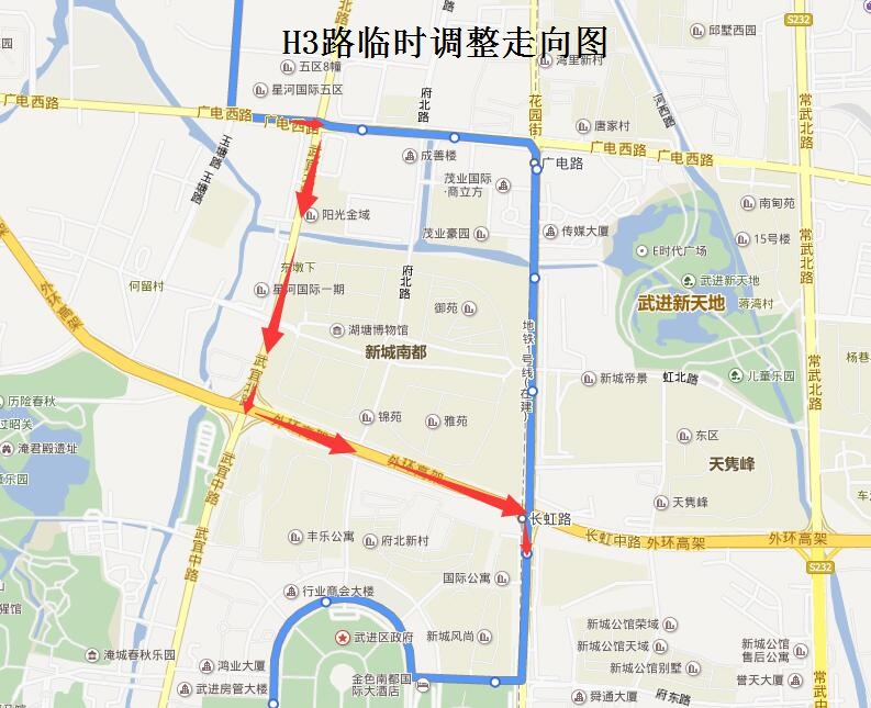 H3路:由淹城公交樞紐始發(fā),按原線路行駛至廣電路蘭陵路路口后,調(diào)整行駛蘭陵路、長虹路至花園街路口后恢復(fù)原線路行駛。撤銷廣電路(蘭陵路—花園街)、花園街(廣電路—長虹路)行駛路段,同步撤銷 “新城南都、新天地廣場(chǎng)、花園街廣電路”南行、“廣電路蘭陵路、泰富灣義務(wù)市場(chǎng)”東行停靠站,調(diào)整行駛路段增設(shè)“四季青服裝城”南行、“長虹路蘭陵路”東行臨時(shí)停靠站。