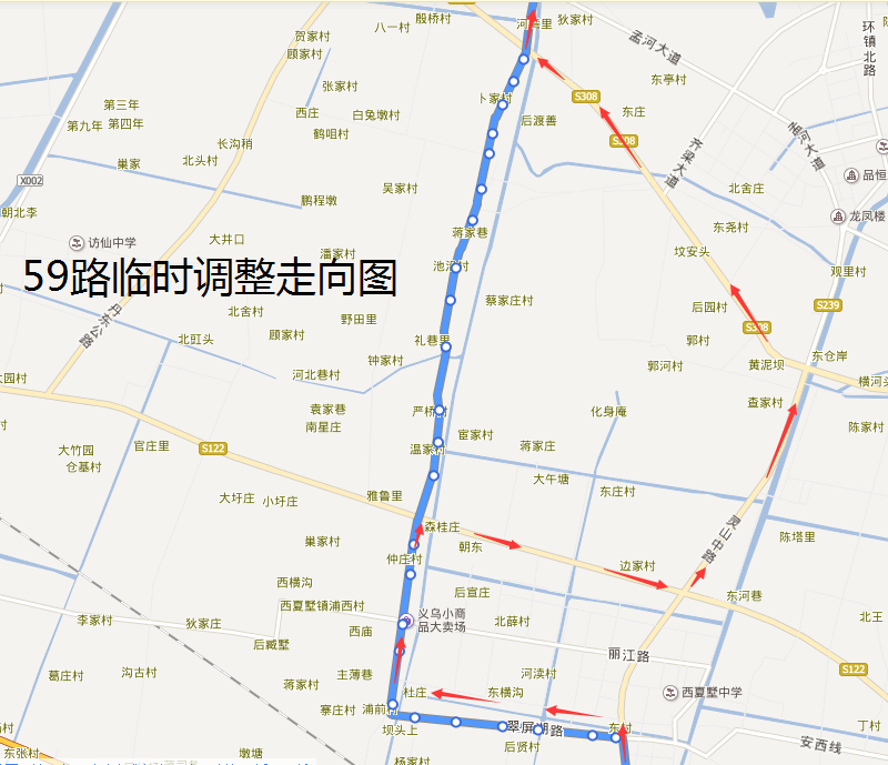 59路:由火車站公交中心站始發(fā),按原線行駛至S239翠屏湖路路口后,調(diào)整行駛S239、微山湖路至浦南大街路口后按原線路行駛至孟浦線S122路口后,再次調(diào)整行駛S122、S239、S308至孟浦線路口后恢復(fù)原線路行駛。臨時(shí)撤銷翠屏湖路(S239-浦南大街)、浦南大街(翠屏湖路-微山湖路)、孟浦線(S122-S308)行駛路段。同步撤銷“西夏墅、前薛村、后葉村、姚家村、東珠墅、石橋頭、楊樹壩、嚴(yán)橋村委、嚴(yán)橋、禮巷里、孔村、池沿上、蔣家巷、萬綏南、萬綏村委、萬綏北、卜家村、仁厚村委、孟河敬老院”雙向??空荆{(diào)整行駛路段新增“微山湖路岳山路、微山湖路浦南大街、孟浦線S308”雙向、“微山湖路S239”西行及“景西華庭”南行臨時(shí)??空?。