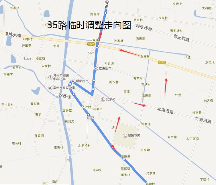 35路:由常州北站始發(fā),按原線行駛至安寧路虎丘路路口后,調(diào)整行駛虎丘路、北海路、薛冶路、S122至魏安路路口后恢復(fù)原線路行駛。臨時撤銷安寧路(虎丘路—永安路)、永安路(安寧路—振興路)、振興路(永安路—S122)行駛路段,同步撤銷“安家東站、安家舍、安家供銷社、振興路永安路、振興橋、三里橋”雙向停靠站,調(diào)整行駛路段增設(shè)“新魏花園北門、虎丘路北海路、北海路獅山路、三里橋北” 雙向臨時??空?。
