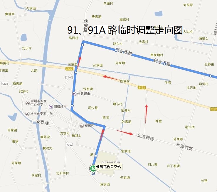 91、91A路:由新魏花園公交站始發(fā),按原線路行駛至虎丘路北海路路口后,調(diào)整行駛北海路、薛冶路、S122至魏安路路口后恢復(fù)原線路行駛。臨時撤銷北海路(虎丘路—振興路)、振興路(北海路—S122)行駛路段,同步撤銷“振興橋、三里橋”雙向??空?,調(diào)整行駛路段增設(shè)“虎丘路北海路、北海路獅山路、三里橋北”雙向臨時??空?。