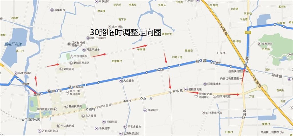30路:由火車站公交中心站始發(fā),按原線行駛至龍城大道大明路路口后,調(diào)整行駛大明路、富民路、興東路、東方路、S232至潞橫路路口后恢復(fù)原線路行駛;臨時(shí)撤銷潞橫路(大明路—S232)行駛路段,同步撤銷“潞橫路龍城大道、潞城、東城橋、陳家塘、彭家塘、光明橋、常燕橋、金豐村、橫山橋金家塘、方家塘、橫山橋農(nóng)副市場(chǎng)西東西向”雙向停靠站,調(diào)整行駛路段臨時(shí)增設(shè)“大明路龍城大道、富民路華豐路、潞城花苑北門、富民路東城路、富民工業(yè)園、彭家塘北、東方創(chuàng)新園、東方創(chuàng)新園東、興東路富民路、興東路潞橫路、(上行增設(shè)興東路東方路)、中高村、省莊小區(qū)、(上行增設(shè)常州汽車客運(yùn)東站)、S232東方路、橫山橋農(nóng)副市場(chǎng)西南北向”雙向停靠站。