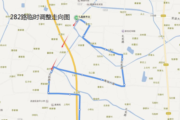 282路:由禮嘉首末站始發(fā),調(diào)整行駛禮政路至禹城大道路口后恢復(fù)原線路行駛;臨時(shí)撤銷貝莊村道(禮政路—禮毛路)、禮毛路(貝莊村道—禹城大道)、禹城大道(禮毛路—禮政路)行駛路段,同步撤銷“王言橋、貝莊頭、貝莊村委、上路、陽(yáng)沿橋、毛家橋、建新橋、禹城”雙向停靠站,調(diào)整行駛路段臨時(shí)增設(shè)“政平變電所”雙向??空尽?/span>