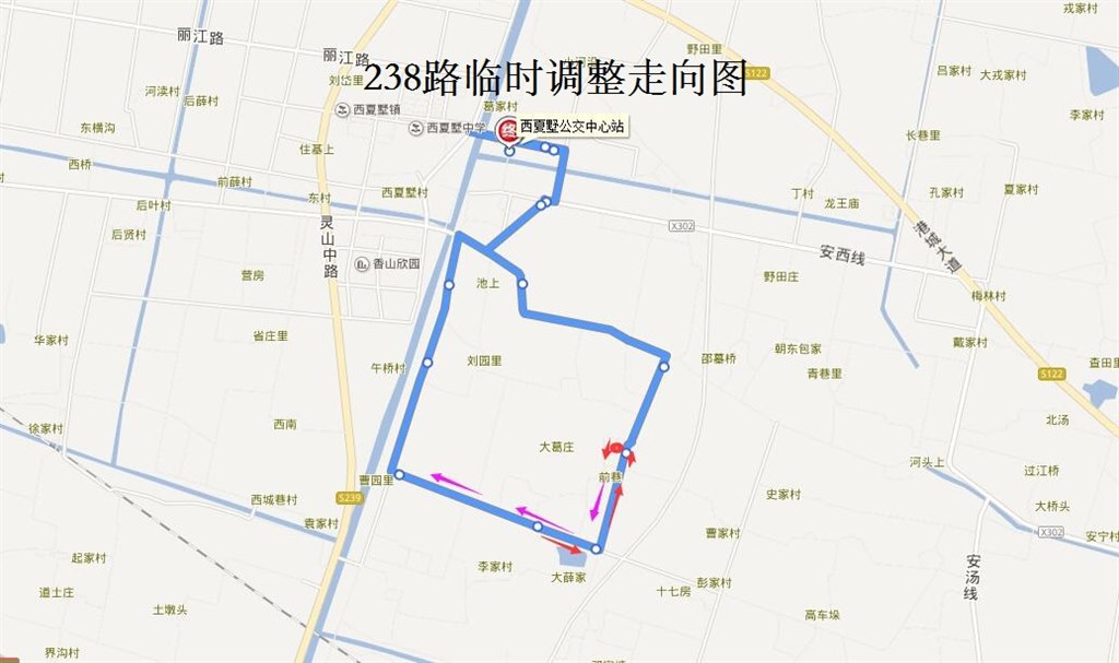 238路:由西夏墅公交中心站始發(fā),按原線行駛至 “東南村委”站后返回。臨時撤銷“ 王家、高巷里”單向??空?。