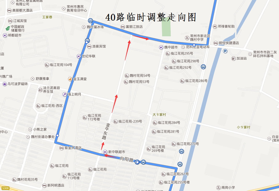 因魏村鎮(zhèn)花苑路封閉施工需實施交通管制,常州公交將于2017年8月4日起對涉及的40路公交做臨時調(diào)整,具體調(diào)整方案如下: