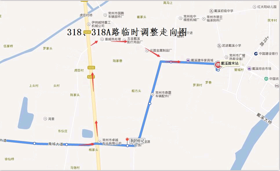318路、318A路:由武進(jìn)公交中心站始發(fā),按原線路行駛至戴毛路S232路口后調(diào)整行駛S232、虎臣路至荷花西路路口后恢復(fù)原行駛路線。臨時(shí)撤銷(xiāo)戴毛路(S232—荷花西路)行駛路段,同步撤銷(xiāo)“管城村、管城橋、船舫河橋”雙向??空荆徽{(diào)整行駛路段增設(shè)“馬馳、羅澤西”雙向臨時(shí)停靠站。